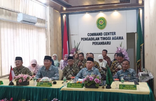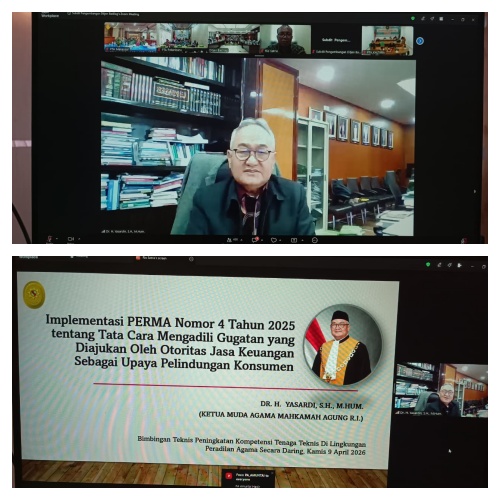 Ketua Pengadilan Tinggi Agama Pekanbaru beserta Wakil Ketua, serta seluruh jajaran Hakim Tinggi, Panitera, Panitera Muda, dan Panitera Pengganti, mengikuti Bimbingan Teknis Tenaga Teknis Peradilan Agama secara daring pada hari Kamis tanggal 9 April 2026. Kegiatan yang ditaja oleh Direktorat Jenderal Badan Peradilan Agama ini mengangkat topik "Peraturan Mahkamah Agung Republik Indonesia Nomor 4 Tahun 2025 tentang Tata Cara Mengadili Gugatan yang Diajukan oleh Otoritas Jasa Keuangan". Materi ini disampaikan oleh Ketua Muda Kamar Agama Mahkamah Agung RI, YM. Dr. H. Yasardin, S.H., M.Hum.