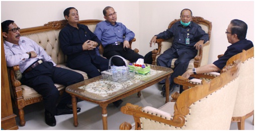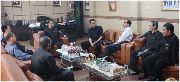 Pimpinan PTA Pekanbaru dan Sekretaris Ditjen Badilag berserta Tim sedang berbincang di ruang kerja KPTA Pekanbaru