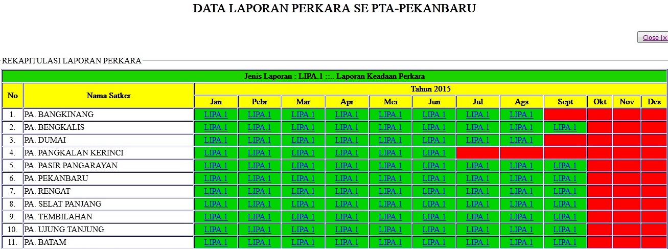 Adapun kelima PA tersebut diantarannya : PA Selat Panjang, PA Batam, PA Dumai, PA Tanjung Pinang dan PA Bangkinang. PA tersebut telah mengupload laporan perkara dengan lengkap yang terdiri dari LIPA.1 (Laporan Keadaan Perkara), LIPA.2 (Laporan Perkara Banding), LIPA.3 (Laporan Perkara Kasasi), LIPA.4 (Laporan Perkara Peninjauan Kembali), LIPA.5 (Laporan Perkara Eksekusi), LIPA.6 (Laporan Kegiatan Hakim), LIPA.7 (Laporan Keuangan Perkara), LIPA.8 (Laporan Rekapitulasi Perkara), LIPA.9 (Laporan Perkara Mediasi), LIPA.10 (Laporan Akta Cerai), LIPA.11 (Laporan Perkara Iwadh), LIPA.12 (Laporan Faktor-Faktor Penyebab Perceraian), LIPA.13 (Laporan Perkara Khusus PP.10), LIPA.14 (Laporan Perkara Sidang Keliling), LIPA.15 (Laporan Perkara Prodeo), LIPA.16 (Laporan Perkara Posbakum), LIPA.17 (Laporan Perkara HHK), LIPA.18 (Laporan Perkara HHKL), LIPA.19 (Laporan Perkara Yang Sudah Di Minutasi), dan LIPA.20 ( Laporan Tingkat Penyelesaian Perkara) dimulai awal bulan Januari sampai dengan Agustus tahun 2015 ke Portal LPO PTA Pekanbaru.