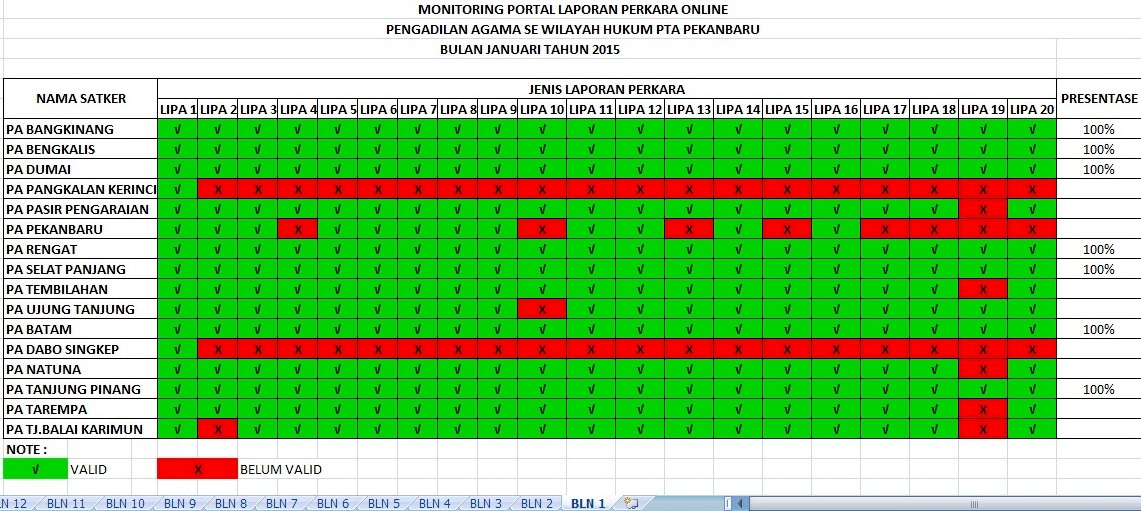 Contoh layout Buku kontrol monitoring upload data laporan perkara pada portal LPO PTA Pekanbaru perbulan Januari 2015, presentase upload data dinilai dari awal bulan hingga Agustus 2015