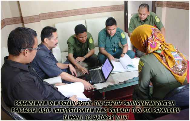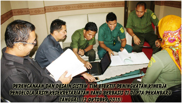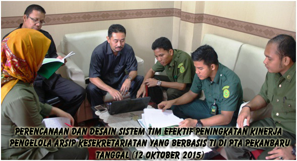 Berdasarkan rencana kegiatan (Time Schedule) pelaksanaan Proyek Perubahan yang telah ditetapkan oleh Wakil Sekretaris (Wasek) Pengadilan Tinggi Agama (PTA) Pekanbaru Drs. Jumaani Soleh, setelah melaksanakan agenda rapat perdana dengan Tim Efektif (05/10/2015). Kini ia kembali menggelar rapat kedua dengan Tim Efektif bahas tentang perencanaan dan desain, menu-menu system arsip elektronik (E-Arsip) dibagian keseretariatan yang akan dibuat (12/10/2015).
