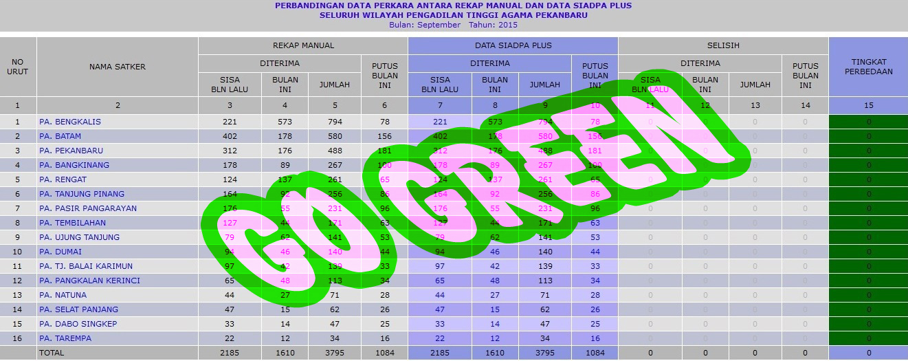 Berhubung saat ini sudah didipenghujung bulan Oktober tahun 2015, untuk itu sesuai dengan program yang telah dicanangkan oleh tim Kepaniteraan Hukum Pengadilan Tinggi Agama (PTA) Pekanbaru untuk terus melakukkan monitoring data Siadpa Plus Pengadilan Agama (PA) di wilayah Hukum PTA Pekanbaru yang telah di upload ke portal Infoperkara.badilag.net.