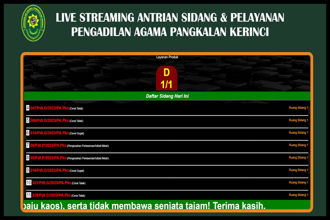 Pengadilan Agama Pangkalan Kerinci telah mengadopsi inovasi terbaru dalam sistem peradilan dengan memperkenalkan Livestreaming antrian sidang melalui flatform YouTube guna untuk memberikan transparansi yang lebih besar dalam proses hukum dan memberikan kemudahan akses informasi kepada masyarakat.